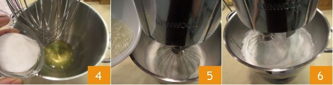 Pour the egg whites into the bowl of a stand mixer, and only when the syrup reaches 238°F, add the remaining sugar (40 g) 4 and turn on the stand mixer. When the syrup reaches 250°F, pour it in a thin stream into the mixer 5, which will still be operating at medium speed 6 until, touching the bowl with your hands, you feel it has completely cooled down.