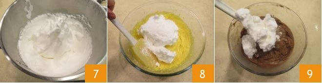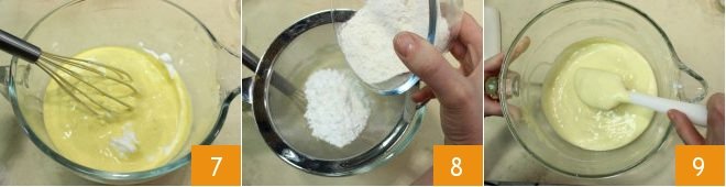 mixing with a whisk 7, and add a pinch of salt. Sift together the cornstarch and flour 8, adding the powders to the egg and sugar mixture with a spatula, gently and without deflating the mixture 9.