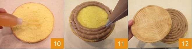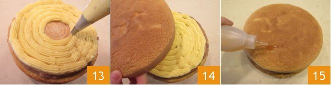 Cover the entire surface with custard using a piping bag 13, saving a bit for filling the cream puffs and for the final decoration. Place the second sponge cake disk 14, pressing lightly with your hands to settle everything, and soak the surface with the remaining syrup 15. Then place the cake in the refrigerator.