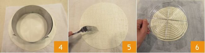 Proceed by unrolling the Puff pastry sheet, and from it, cut out a 22 cm disk with a pastry cutter 4, pierce it densely with a fork in both vertical and horizontal directions 5. Transfer it to a baking sheet and place a steel rack on top 6 to prevent it from puffing up during baking.