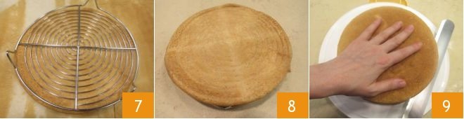 Bake in a preheated static oven at 356°F for about 25 minutes (if using a fan oven, bake at 320°F for about 20 minutes). Once the disk is golden, take it out of the oven 7 and let it cool on a rack 8. Retrieve the sponge cake, now cold, cut it in half to obtain 2 layers 9.