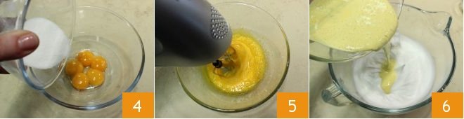 Combine the yolks with the remaining sugar 4 and whip these too with a mixer 5, until you get a fluffy, light-yellow mass. Gently fold the whipped yolks into the egg whites 6,