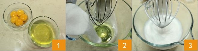 To prepare the Saint Honoré cake with sponge cake, start with the Sponge cake, using the cold-separated method. Separate the yolks from the whites 1 and whip the latter with half the sugar 2 until you obtain a white and frothy mixture 3.