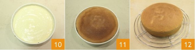 Pour everything into a greased and floured 22 cm diameter cake pan 10, then bake in a static oven at 356°F for about 40-45 minutes (if using a fan oven, bake at 320°F for about 40 minutes). Remove the sponge cake from the oven 11 and let it cool on a rack 12.