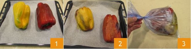 To prepare the salad with tuna, mozzarella, and peppers, start by washing the peppers, then place them on a baking tray lined with parchment paper 1 and let them cook at 482°F for about 30 minutes or until you notice the skin is blistered 2, occasionally turning the peppers for an even roast. Once cooked, put the peppers in a food bag and leave them closed like this to cool 3