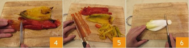 Once the peppers have cooled, remove the skin, which will peel off very easily 4. Then cut them in half, remove the top and the inner seeds, and slice them into strips about 0.4 inches thick 5. Clean the endive by removing the tip 6,
