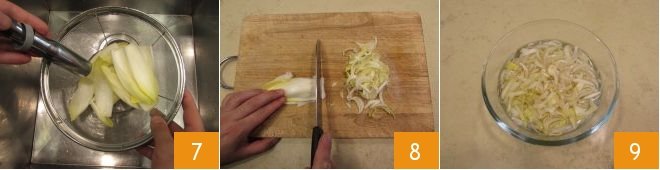 completely remove the leaves and rinse under running water 7 to remove any soil residue. After letting them drain for a while, slice the endive into strips with a knife 8 and place them in plenty of cold water 9 to prevent the cut parts from oxidizing and changing color.