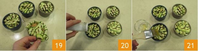 Then, bring the zucchinis one at a time towards the center to completely cover the heart of potatoes and salmon 19. Adjust with a pinch of salt 20 and brush the surface of the molds with about 1 teaspoon of oil 21.