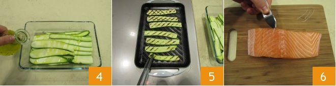 Place them in a shallow and wide container slightly overlapping and drizzle with 1.5 tablespoons of oil 4, so they will maintain a bright color even during cooking. Meanwhile, heat a grill and when it is hot, cook the zucchinis for 1-2 minutes. Halfway through cooking, using kitchen tongs, flip them to cook on the other side for another 1-2 minutes 5. Once ready, place them back in the same container and set aside. Now take the salmon: remove the bones with kitchen tweezers 6 and if your salmon fillet has skin, cut it away with a sharp knife, trying not to remove the flesh.