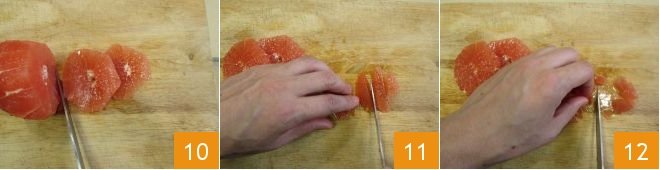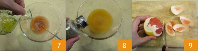 and whisk it quickly while pouring the oil in a thin stream 7 to better emulsify the mixture. Season with salt and pepper 8. Then peel the other grapefruit 9