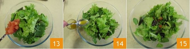 Rinse, dry, and transfer the salad greens into a large bowl, add the grapefruit cubes 13 and mix 13. Dress with a bit of the grapefruit dressing you prepared earlier (try to dress at the last moment so the salad doesn’t wilt) 14 and mix again 15.