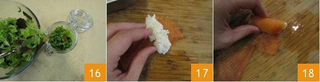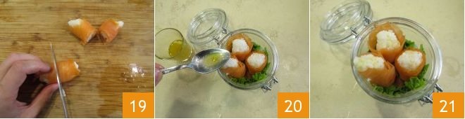 Then divide the salad into 4 glass jars 16 (or in 4 small bowls) and assemble the salmon bites: place a slice of smoked salmon on the surface, add a bit of rice lightly pressed with your hands 17 and roll it to create a roll 18.