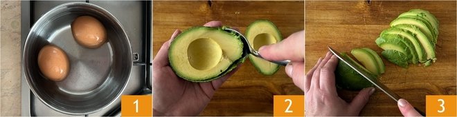 To make the salmon club sandwich, start by preparing the hard-boiled eggs: place the whole eggs in a saucepan, cover with water, and cook for 8 minutes from the moment the water starts boiling 1. Meanwhile, prepare the other ingredients: cut the avocado in half, remove the pit, and scoop out the flesh from the skin with a spoon 2, then slice it not too thinly 3.