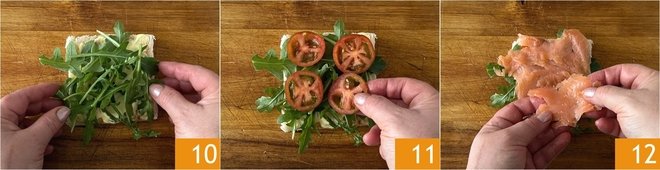 Add some arugula leaves 10, place the tomato slices 11, and season with a pinch of salt. Continue with the smoked salmon 12.