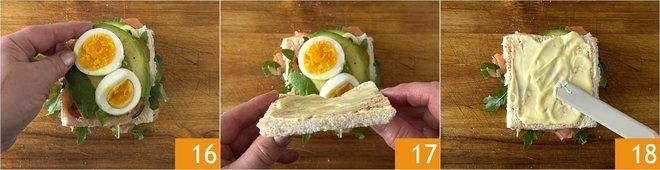 Lastly, add the sliced hard-boiled eggs 16. Spread another slice of bread with mayonnaise and place it with the mayonnaise side facing the eggs 17. Spread mayonnaise on the side facing up 18 and continue by repeating the same sequence of ingredients.