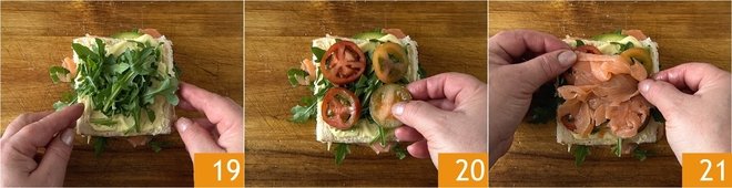Arugula 19, tomatoes 20 and salt, then smoked salmon 21 and lemon juice.