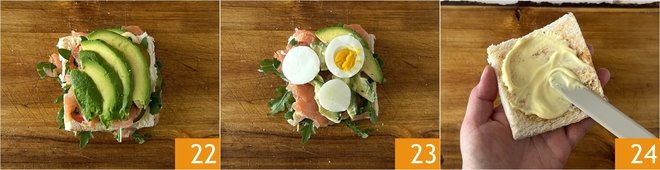 Finally, avocado 22, pepper, and hard-boiled eggs 23. Spread another slice of bread with mayonnaise 24.