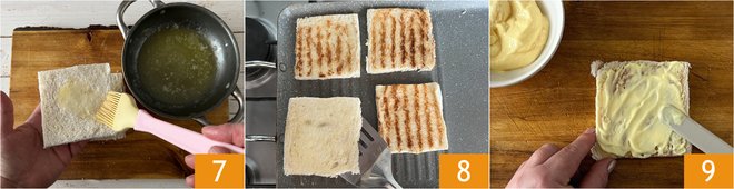 Brush the slices of bread with the melted butter 7, then toast them briefly on a grill on both sides 8. You are ready to assemble the first club sandwich: first, spread one slice of bread with mayonnaise 9.