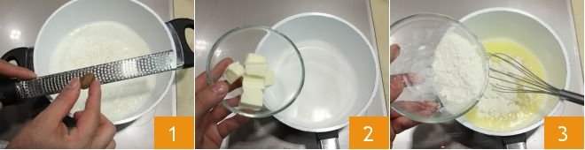 Turn the heat back on low and continue stirring until the flour and butter mixture becomes golden: this way, you will have obtained the roux 4. At this point, pour some warm milk into the saucepan to thin the base 5, then add the rest of the milk and stir vigorously with the whisk until the sauce has reached a rather fluid consistency 6.