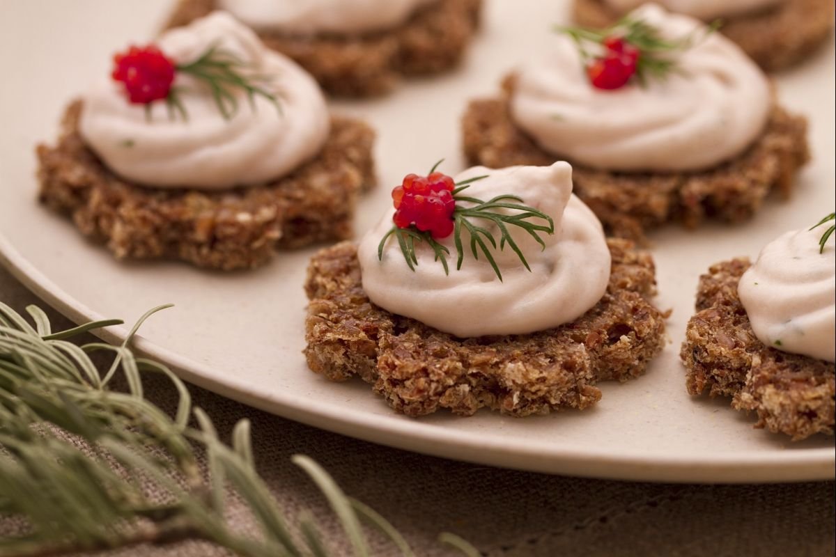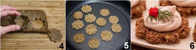 Using cookie cutters (we used flower-shaped ones), cut shapes out of the slices of black bread 4, then toast the bread in the oven or in a non-stick pan to create a crunchy crust 5. Spread the salmon mousse on the crostini and serve, garnishing with sprigs of dill and fish eggs 6. For an even more refined touch, you can place the mousse in a piping bag with a star tip and create dollops on the crostini! Enjoy your meal!