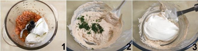 To prepare the salmon mousse, start by finely chopping the ricotta together with the smoked salmon in a mixer 1. Wash the dill and chop it with a knife, then add it to the mixture 2. At this point, combine everything, season with salt if needed, and pepper to taste. Whip the fresh cream until stiff peaks form and incorporate it into the salmon cream with a spatula, being careful not to deflate it 3.