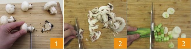 To make the salmon sticks with herb mushroom cream, first clean the champignon mushrooms, trim the base 1 and remove any soil residues with a cloth; then slice them thinly 2. Trim the spring onion and cut it into rings 3.