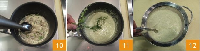 Turn off the heat and blend the mixture with an immersion blender 10 until you get a smooth cream, add the fennel and marjoram 11 and let it infuse. Once the sauce has cooled, pass it through a sieve 12 to make it smoother.