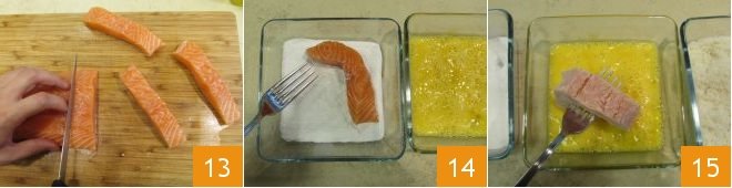 Divide the salmon into 8 equal rectangles of about 1 x 4.5 inches 13. Pass each stick first in rice flour 14, then in beaten eggs 15