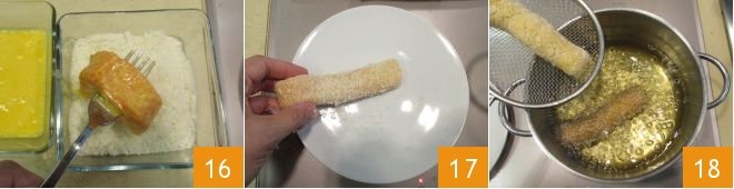 and finally in panko 16. Once you have breaded all the sticks 17, you can proceed to frying: place seed oil in a saucepan and heat it; when it reaches a temperature of 340°F you can immerse the sticks 18, a few pieces at a time, for about 2 minutes or until they are golden brown.