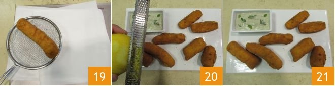 Once cooked, drain the sticks on absorbent paper 19. Flavor the salmon sticks with lemon zest 20 and serve them hot with mushroom cream 21.