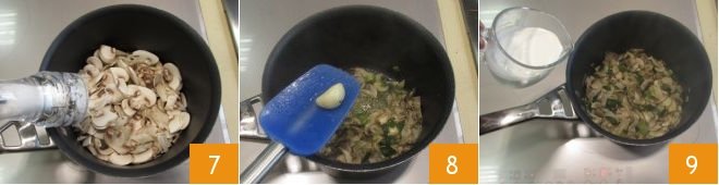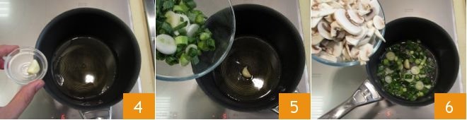 In a saucepan, pour the oil and add the garlic 4, sauté for 3 minutes over moderate heat and then add the spring onions 5 and mushrooms 6