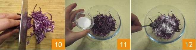 In the meantime, deal with the red cabbage: cut it finely 10, transfer it to a bowl and add the salt 11. Mix with a fork 12, wait 15-20 minutes,