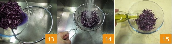 then drain it from the liquid it will have released 13 and rinse it under running water 14; this step is to tenderize the cabbage. Transfer it again to a bowl and season with pepper and oil 15. It will not be necessary to add salt.