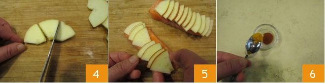 and cut each slice into three triangles 4. Take your salmon fillets and lay the apples on top 5. Take another small bowl and add paprika and turmeric powder (a pinch of each will suffice) 6