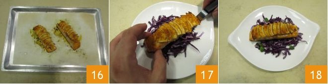 Remove the cooked and well-browned fillets 16; arrange a bed of red cabbage on a serving plate and place the fillets on top 17, decorate with mint leaves and serve immediately 18.