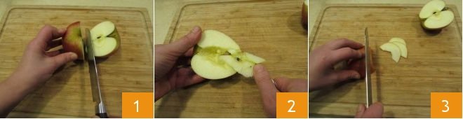 To prepare salmon with apples, start with the apples. Wash them, cut them in half 1, and use a small knife to remove the core 2. Then slice the apples into not too thin slices 3