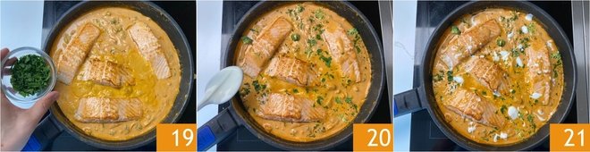 After this time, add some chopped parsley for aroma 19 and garnish with a few dollops of yogurt 20. Your salmon with curry and coconut milk is ready to be served 21!