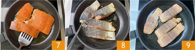 Cut the salmon fillet into 4 equal parts 4, then salt 5 and pepper the surface. Heat the oil in a large pan and place the fillets skin side down 6.