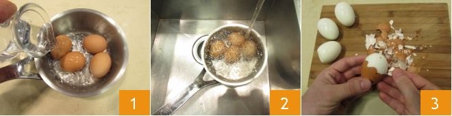 To prepare the Bolzano sauce, start with the Hard Boiled Eggs. Place them in a saucepan and cover with cold water 1, then from the moment it boils, count 9 minutes. When cooked, cool them under a stream of cold water 2 and shell them 3.