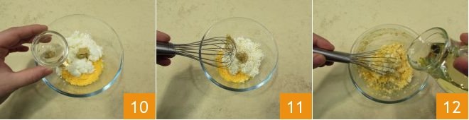 Add mustard and vinegar as well 10, adjust with salt and pepper, and start carefully blending the ingredients with a whisk 11. As you continue to mix, also incorporate the oil 12, pouring it slowly.
