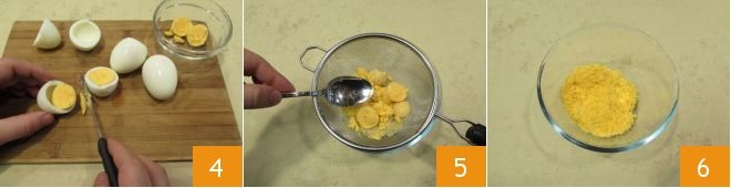 Cut the eggs in half 4, extract the hard yolks and press them through a sieve 5 to obtain a fine puree 6.