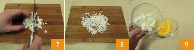 Meanwhile, you can achieve a very fine mince 7 from the whites simply using a sharp blade 8 and then combine with the yolks 9.