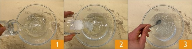 To prepare salted almonds, first pour warm water into a bowl 1, add the coarse salt 2, and stir to dissolve it 3.