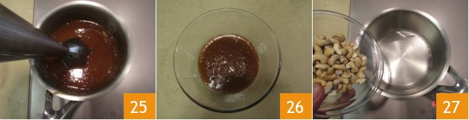 With an immersion blender, blend the salted caramel 25, transfer it to a bowl 26, let it cool to room temperature, then transfer it to the fridge until use. In a saucepan, pour a tablespoon of vegetable oil, turn on moderate heat, and add the cashews 27.