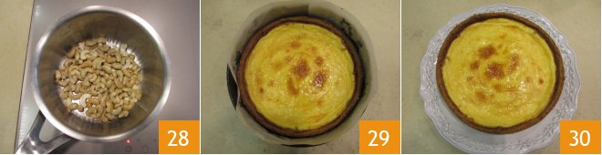 Toast them for a few minutes until they are well golden 28. Transfer to a bowl and let cool. After the cheesecake's baking time, take it out of the oven 29 and let it cool. Then, transfer it to a serving plate 30.