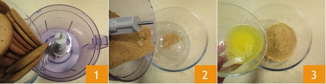 To prepare the salted caramel cheesecake, melt the butter over very low heat and let it cool. Then pour the cookies into the mixer 1 and blend them until completely crumbled. Transfer them to a bowl and pour in the cooled melted butter 3.