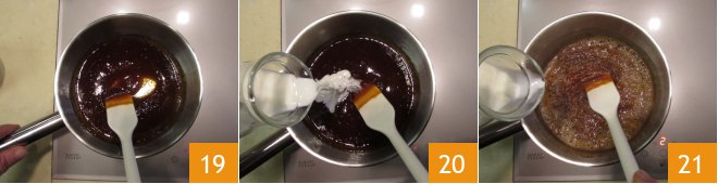 When the sugar is almost melted, use a ladle to stir the caramel. You should obtain an amber color 19. At this point, turn off the heat and gradually add the hot cream 20 21, stirring quickly.