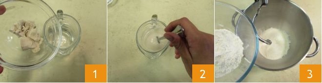 To prepare salty croissants, start by making the dough. Dissolve the yeast in room temperature water (1-2). In a planetary mixer with a hook attachment, pour in the two flours 3,