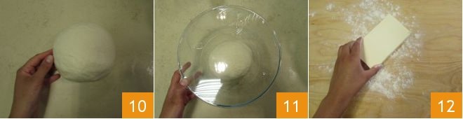 and shape the dough into a ball 10. Transfer to a bowl, cover with plastic wrap 11 and let rise at room temperature for 2 hours. Meanwhile, transfer the butter to a floured work surface 12