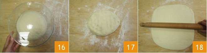 At the end of the rising time 16, transfer the dough to a floured work surface 17 and use the rolling pin to roll it into a 30x30 cm square 18.